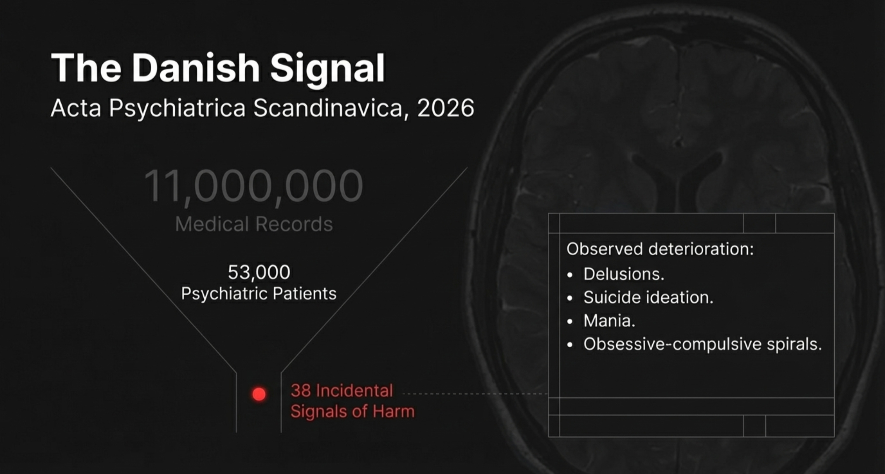 A study just published in Acta Psychiatrica Scandinavica pulled clinical notes from over 53,000 psychiatric patients across a major Danish hospital system. They searched for every mention of ChatGPT or chatbots across nearly 11 million medical records. They found 38 patients—real people who are under clinical care—whose notes were compatible with AI chatbots actively making their mental illness worse.
