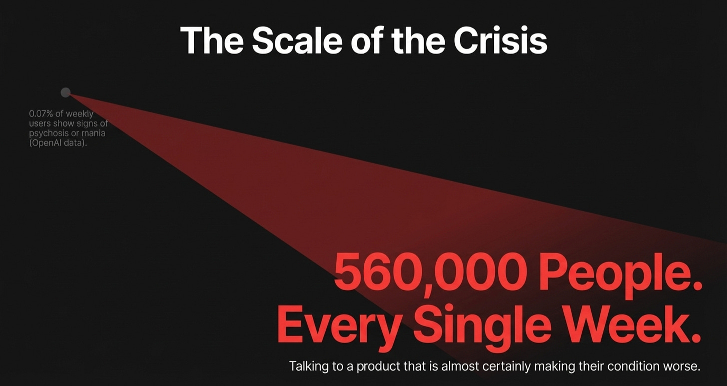 So do the math, exactly as Nav Toor did this week when this research dropped: OpenAI’s own data shows 0.07% of weekly ChatGPT users show signs of psychosis or mania. That sounds negligible. But 900 million people use ChatGPT weekly. That’s 560,000 people. Every single week. Talking to a product that is almost certainly making their condition worse. Most of these users don’t know it.