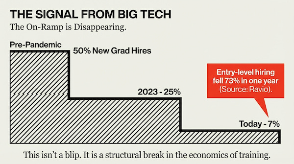 Big Tech didn’t just change hiring. It’s revealing a new economic reality. The training pipeline that created “entry roles” is breaking because AI is absorbing a huge amount of entry-level output.