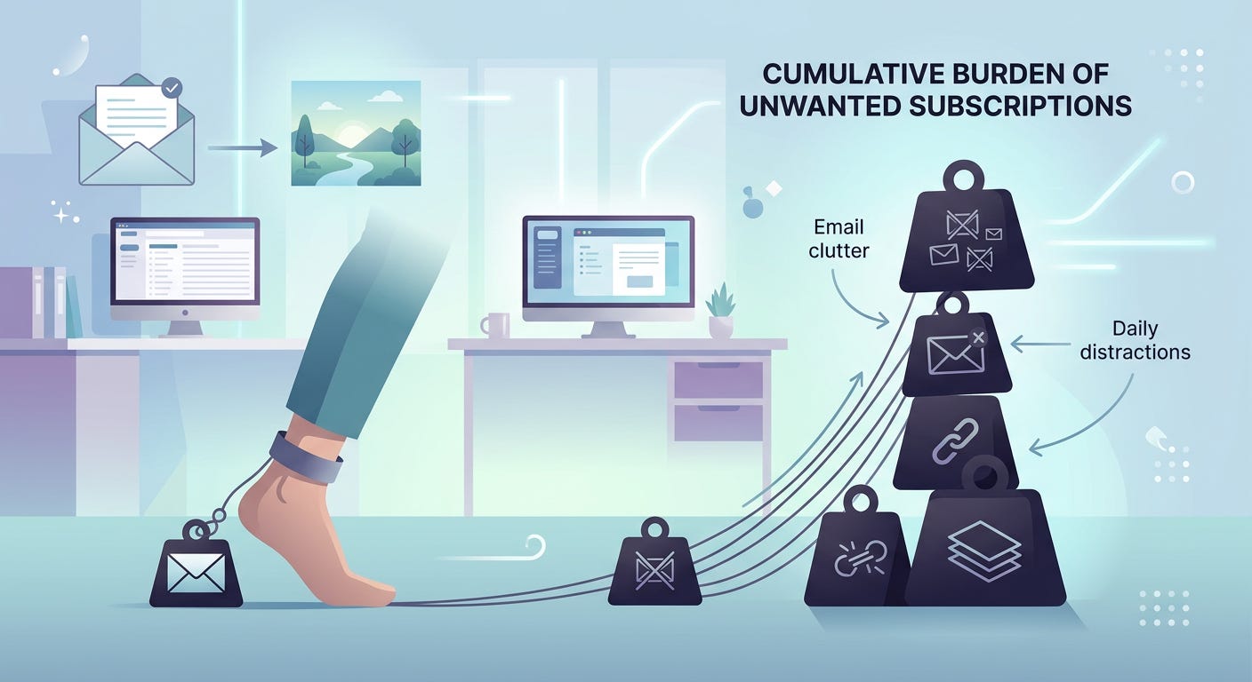 Subscriptions you signed up for during a project that ended. That research newsletter you subscribed to when you were writing the white paper in 2022. That industry digest you joined when you were doing research. That platform you set up for the conference you attended in 2023. The conference is over, but not the emails.
