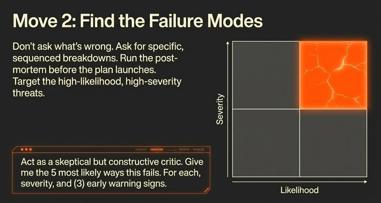 This is different from asking “what’s wrong with my plan.” Failure modes are specific, plausible, sequenced breakdowns. The kind of thing a post-mortem would identify if you ran the plan and it failed. You want to run the post-mortem before the plan, not after.