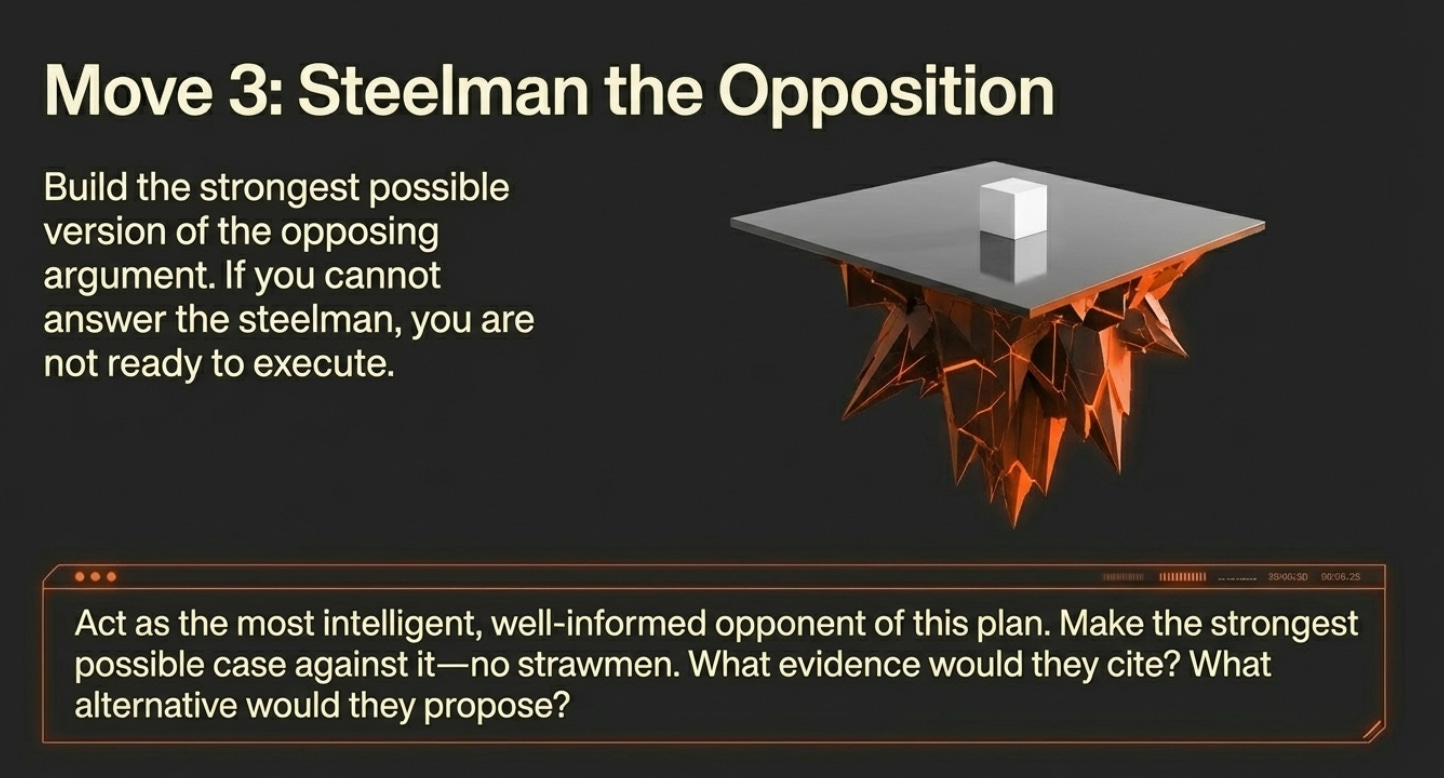 This is the steelman, which is building the strongest version of the opposing argument. It’s uncomfortable. It should be. The goal isn’t to talk yourself out of your plan. It’s to understand the opposition well enough to either address it genuinely or to discover that it’s right.
