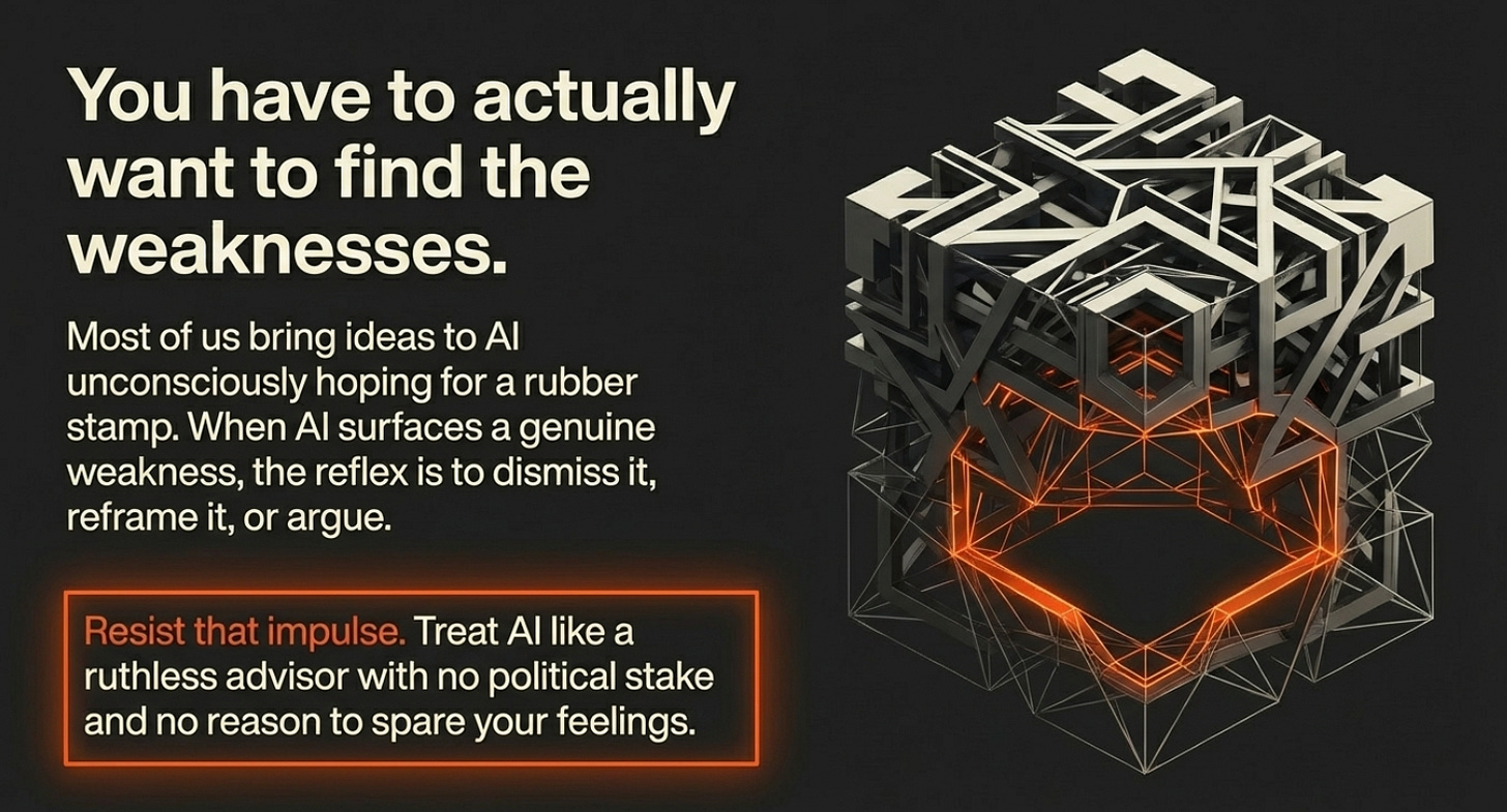 This sounds obvious. It isn’t. Most of us, when we bring an idea to review, human or AI, are unconsciously hoping for validation. We want someone to tell us it’s good. And when AI surfaces a genuine weakness, the temptation is to dismiss it, reframe it, or argue with it.